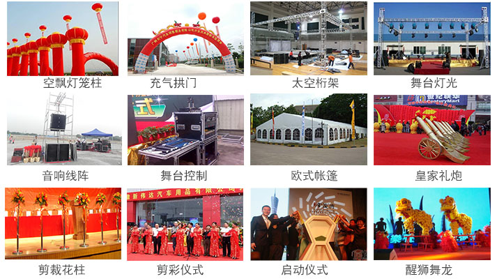 及物料租赁:灯光及音响及舞台行架等演出活动物料 贵宾桌椅、铁马、注水道旗、彩虹门、空飘等庆典道具物料 暖场物料包含拉斯维加斯桌、充气城堡系列、花车女王、水池、真人版娃娃机、皇家马车、美女不倒翁、等等房地产及商场暖场等等很多物料, 以上物料均本公司一手物料 欢迎仓库参观。